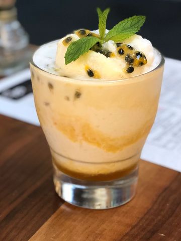Coconut cream and condensed milk slushy topped with passion fruit pulp